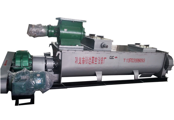 DSZ型粉尘加湿搅拌机由均匀供料、叶片输料、混合击打加湿、振动系统四部分构成,配以电控和供水系统。整体固定在一支架上,筒体由四组弹性元件支撑,通过激振装置,使整机在运转过程中,筒体高频振动,筒壁与搅拦轴之间始终保持一定的间隙,减小了运转阴力,杜绝了闷机、堵转现角,减少了停机清理时间,提高了工作效率。